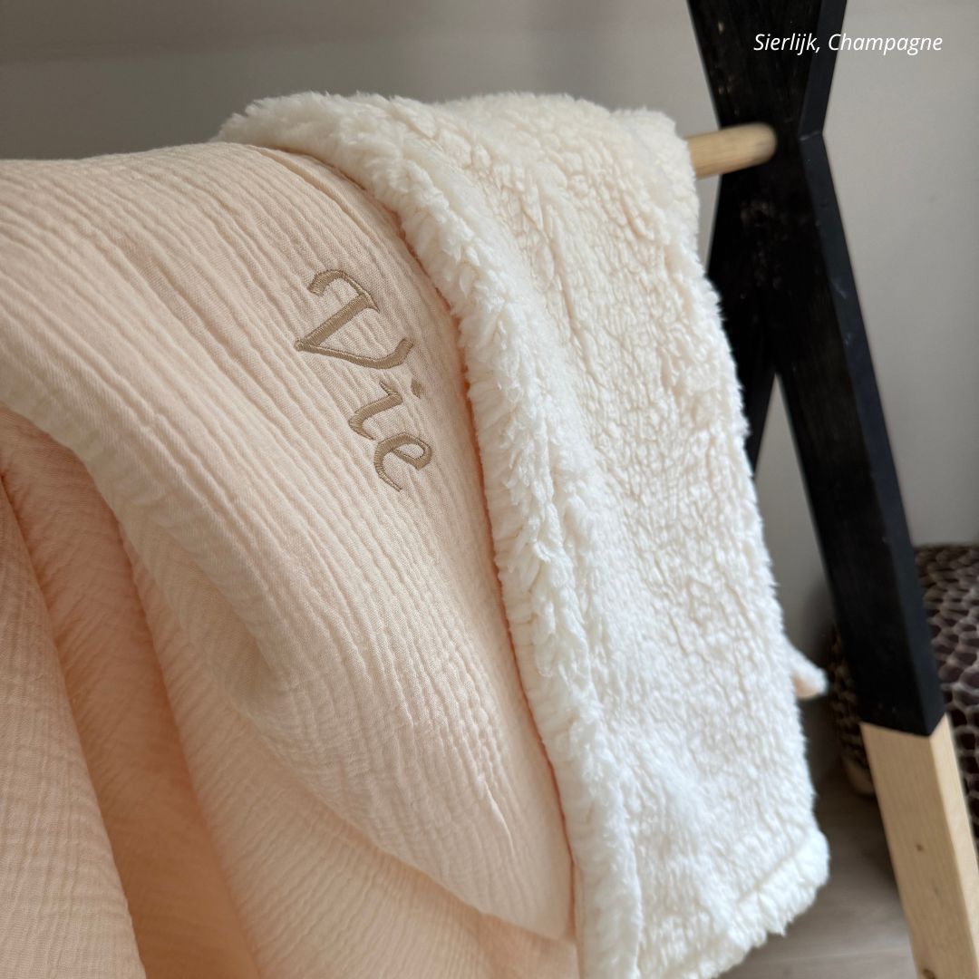 Een heerlijke biologische mousseline katoenen deken met pluizige sherpa fleece. Speciaal ontworpen voor pasgeborenen, biedt deze warme deken ultieme zachtheid en warmte voor de gevoelige babyhuid. Maak het extra bijzonder met een persoonlijke touch: voeg een naam, initialen of uniek ontwerp toe en creëer een uniek kraamcadeau. Dankzij de ademende, duurzame materialen en op maat gemaakte afmetingen past deze deken perfect bij de behoeften van jouw kleintje.
